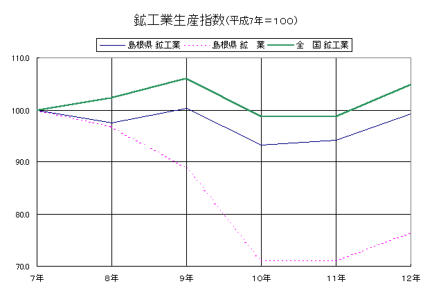 | 島根県 鉱 業 | 100.0 | 96.9 | 88.8 | 71.0 | 71.0 | 76.3 | |
