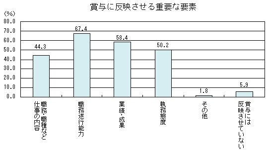 賞与に反映させる重要な要素としては、「職務遂行能力」が一番高く67.4%を占め、次いで「業績・成果」58.4%、「執務態度」50.2%、「職務・職種などの仕事の内容」44.3%と続いている。